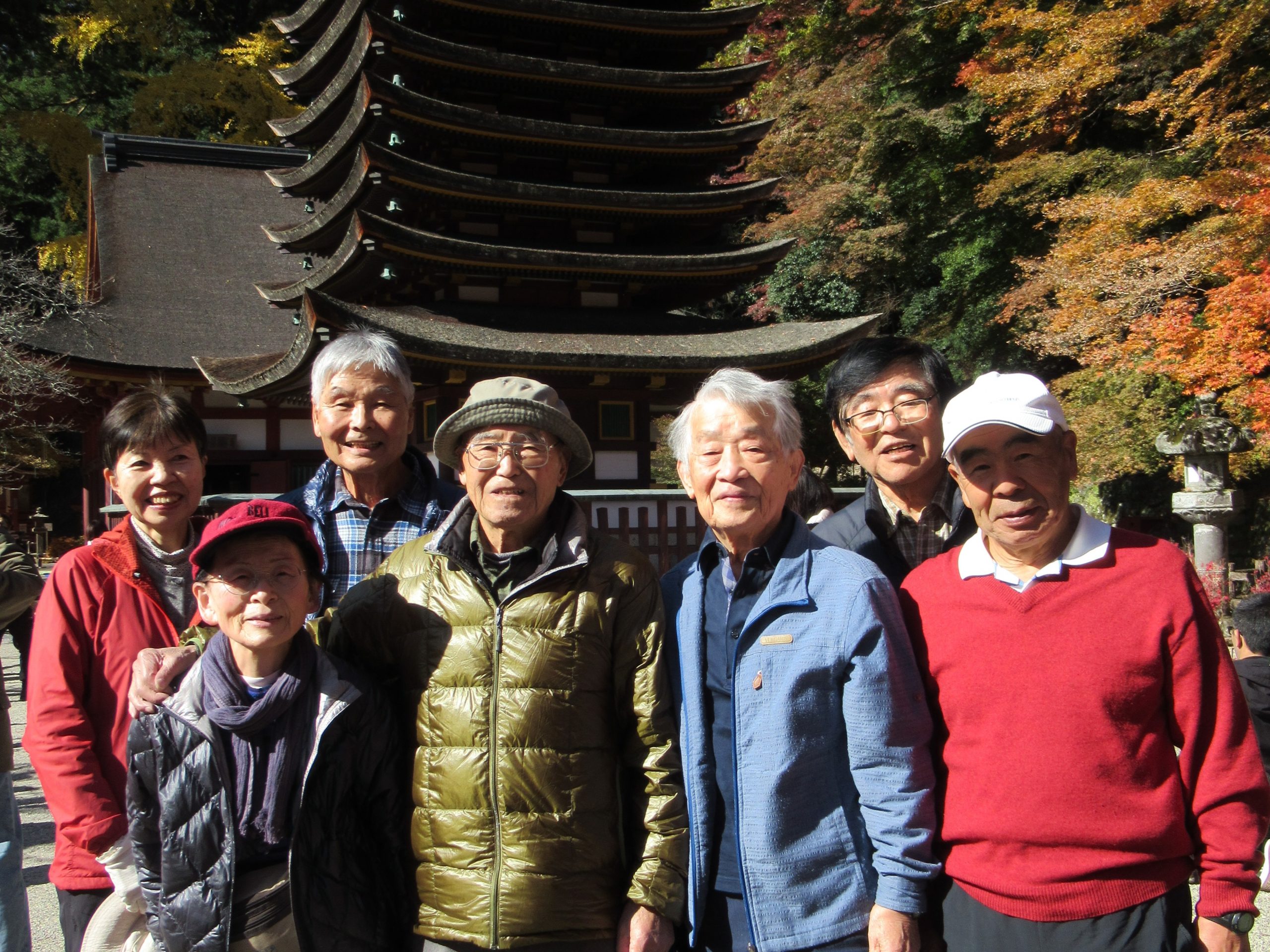展示物を拝観した後世界唯一の木造十三重塔(重文)(白鳳7年(678)唐から帰国した鎌足の長男・常慧和尚が十三重塔と講堂を建立して妙楽寺と称する)を背景に記念の集合写真を撮る。