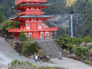 那智大社から歩くと、青岸渡寺をとおり、三重塔で、那智の滝、桜のコラボを見て歩きました。