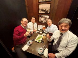 年次総会終了後は横浜駅へ移動し、4名で懇親会を開催いたしました。プレミアム・モルツ〈香るエール〉で乾杯した後、これまでとは趣向を少し変え、ワインを中心に湘南の魚料理を肴に、近況報告や大阪万博訪問の報告、東京支部の今後の活動など、話に花が咲きました。
